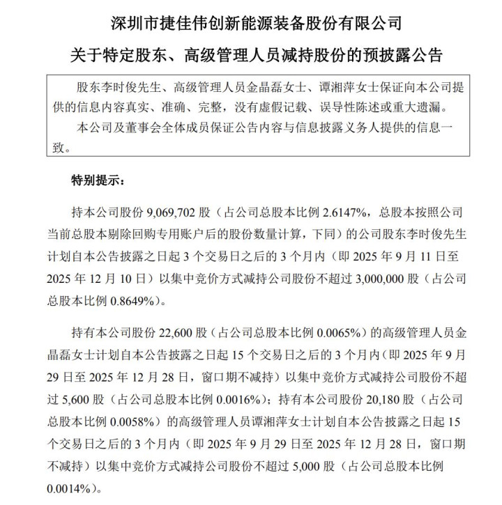 值得注意的是,在行业回暖之际,捷佳伟创的特定股东以及高管就抛出了一份减持计划。根据公告显示,特定股东李时俊计划减持不超过300万股,占公司总股本的0.8649%;高管金晶磊计划减持不超过5600股,占总股本的0.0016%;高管谭湘萍计划减持不超过5000股,占总股本的0.0014%。
