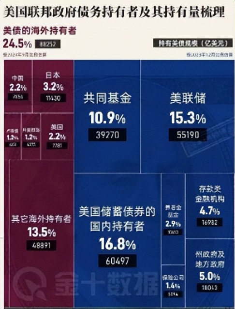 虽然美债是全球投资者都会参与的一个标的,全球各国都会买入,可占比最大的是美国储蓄债务的国内持有者和美联储,总的来说,美债海外持有者只有24.5%,其大头都是美国人自己持有。
