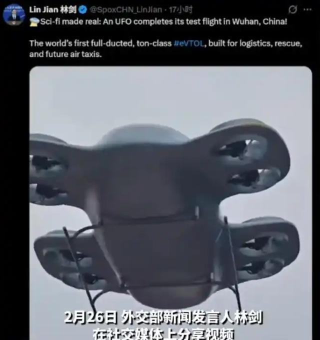 2月26日,外交部发言人林剑在社交平台上发布了“飞碟”在武汉试飞的视频,这款叫做“电鹰飞车EFC1200”的全球首架全涵道式吨级电动垂直起降飞行器亮相,可以说是填补了全球在这一领域的技术空缺,也为中国在保持空中优势地位上奠定了更加坚实的基础。